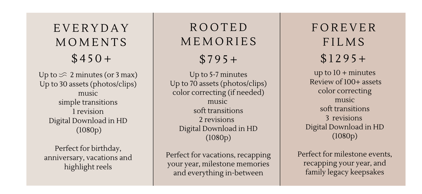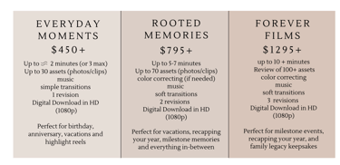 At Rooted in Moments, we excel in transforming your cherished memories into stunning home videos. Our packages start at just $450 and are designed to meet your unique needs. To make this process seamless, we invite you to fill out the form below (no obligation required) to provide us with key details about your project. Once you've completed it, you'll receive an email from us, and we’ll take it from there to turn your beautiful memories into lasting keepsakes.